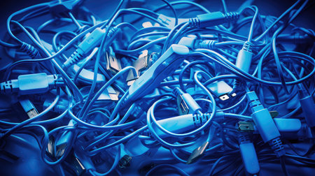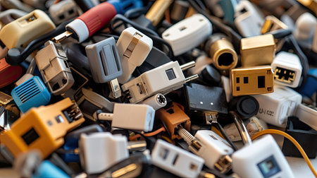 Pile of used smartphone wired chargers,electronic waste,tech device tools