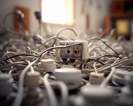 An AI-generated illustration of an assortment of electrical components, including wires and plugs