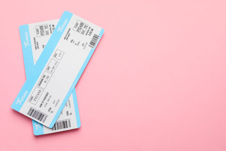 Travel agency. Flight tickets on pink background, top view. Space for text