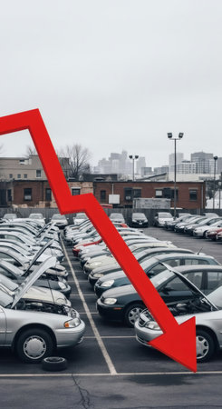 Red arrow showing decreased sales on a parking lot with used cars. Economic recession and market decline for stock photo.