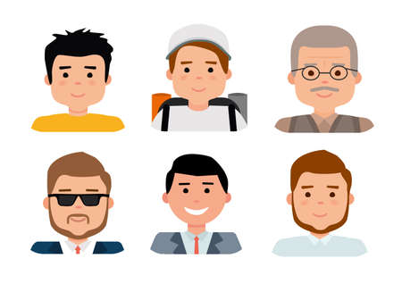 Flat avatar collection, set of 6 man icons in flat style with faces, avatars group of people.