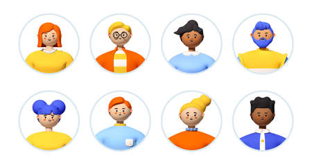 People avatars in circles cartoon illustration set. Multinational users of social networks. Men, women, students or pupils faces or portraits. Cyberspace, diverse concept