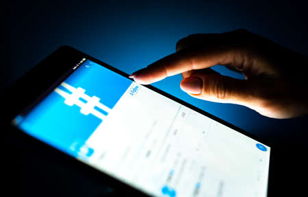 Kharkiv, Ukraine - 12 November 2018: close up girl hand using tablet with Twitter app on the screen with a dark background