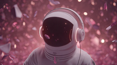 An astronaut wearing illuminated headphones is the central figure, set against a background of pink petals and bokeh lights. The composition has a soft, diffused lighting with predominantly pink hues. This imagery is suitable for various commercial purposes, including advertising, editorial content, and design projects.