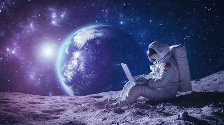 Space explorer typing on a laptop on the lunar surface, with Earth and stars as a backdrop, emphasizing technology in space.