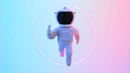 A man astronaut in a space suit standing in front of a neon pink background.