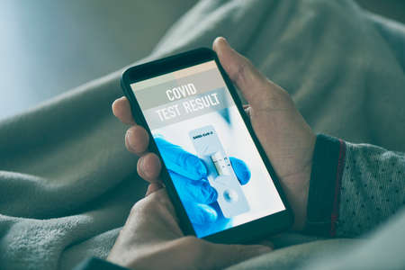 a young man in pajamas, lying on his sofa wrapped in a blanket, checking the result of his covid test in a simulated app in his smartphone, that reads covid test result, and shows a negative result