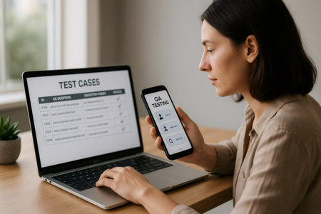 Professional woman analyzing mobile app QA testing cases using a smartphone and laptop, focusing on software quality assurance and efficiency