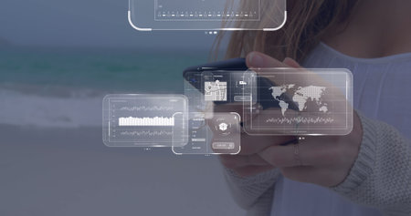 Image of data on screens over caucasian woman with smartphone. Global networks, business, finances, computing and data processing concept digitally generated image.