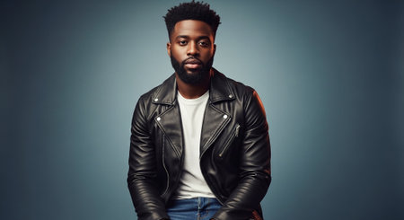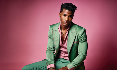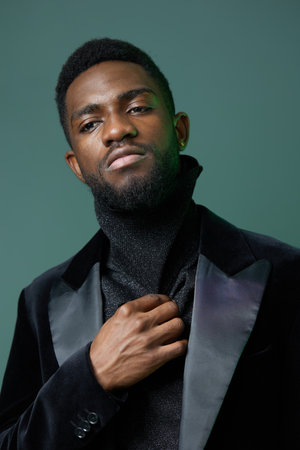 Confident black man in stylish black turtleneck and jacket posing against a vibrant green background