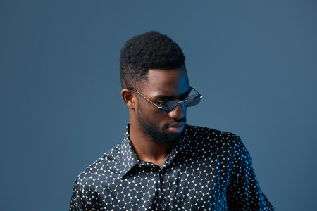 Handsome young African man with glasses and casual wear on dark blue background. Stylish and successful fashion designer or modeler.