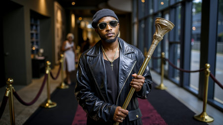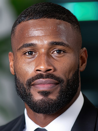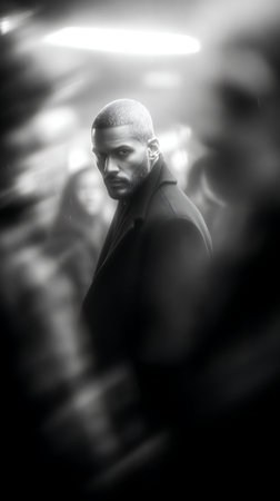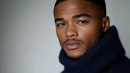 Close up of a stylish man with a deep expression, showing confidence in an indoor setting.