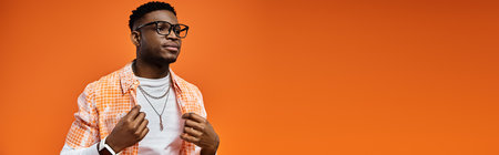 Handsome young African American man with glasses posing against bold orange backdrop.