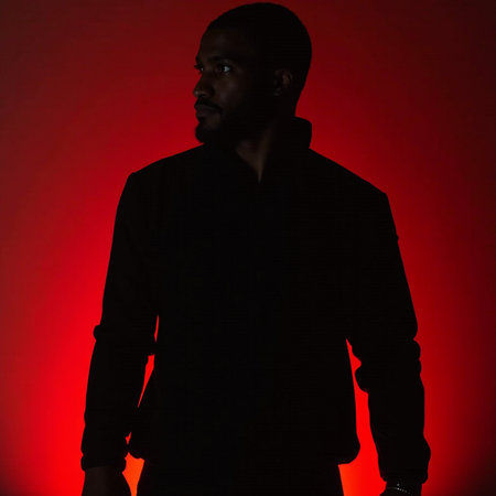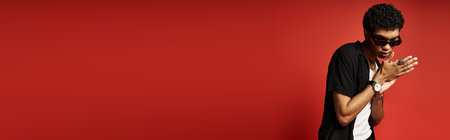 Handsome African American man in sunglasses poses against vibrant red backdrop.