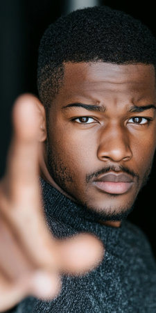 Intense Gaze of a Young Man Pointing Forward with Focus and Determination.