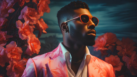A man poses confidently with sunglasses on, showcasing a fashionable outfit against a backdrop of vivid colors and artistic lighting. The setting reflects a contemporary and creative atmosphere