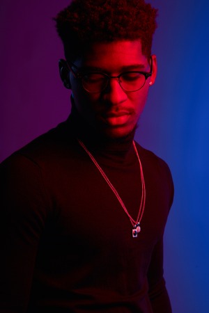 With sunglasses. Futuristic neon lighting. Young african american man in the studio