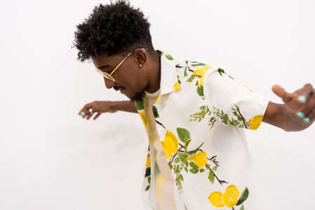 A young Cuban man in a floral shirt and sunglasses dancing on a white background