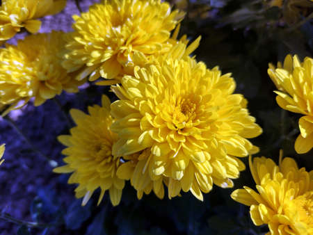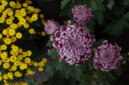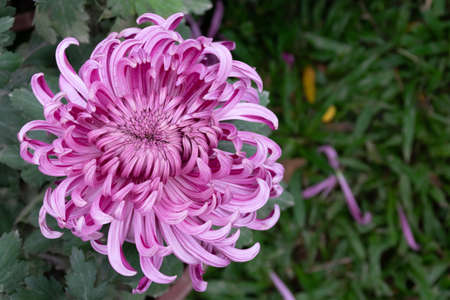 Beautiful Purple Chrysanthemums flowers background. Macro photo taken from above