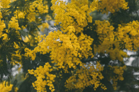 Close up of yellow mimosa flowers in full bloom, natural floral background