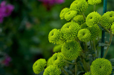 Green chrysanthemums close - up on a blurry background. Floral bright autumn background. Macrophotography of autumn flowers in selective focus.