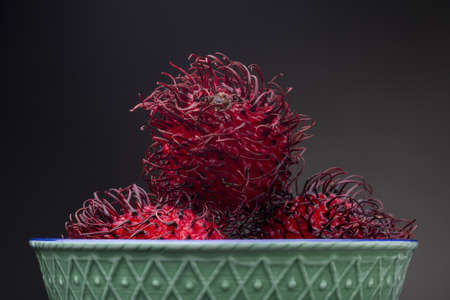 Dessert bowl vintage decorated with colourful red contrasting exotic Rambutan fruit against a dark background. Studio low key food still life.