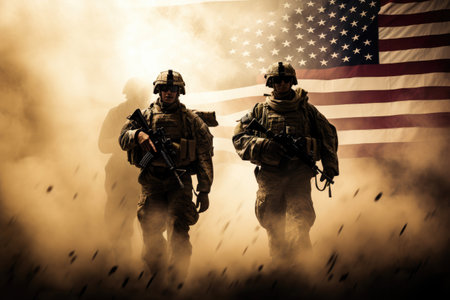 rangers during the military operation. anti terrorism military concept. The American military on the background of the star-spangled American flag. The concept of homeland protection and patriotism.
