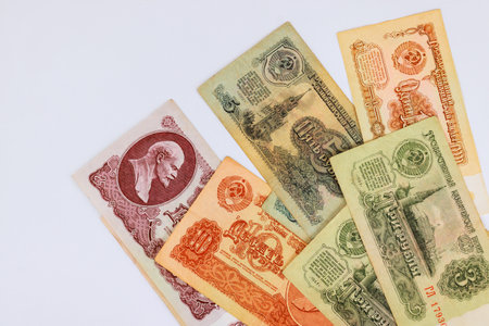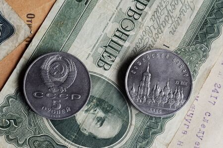Old money of the USSR close-up. Macro photography of vintage banknotes of the Soviet Union, retro details