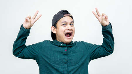 A portrait of handsome attractive cheerful Asian Malay man with cap showing v-sign or peace having fun isolated on isolated white backgrounds.