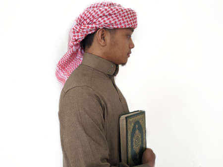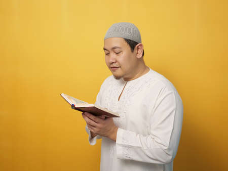 Portrait of young Asian muslim man reading the holy Quran against yellow background, Islamic subject, Ramadan kareem or ied mubarak concept
