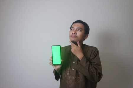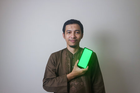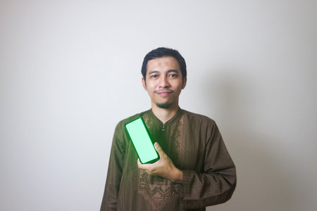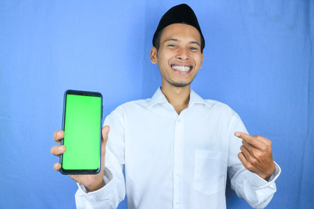 Happy Young Asian Muslim man showing blank green phone screen and pointing phone screen