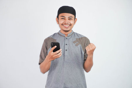 Excited or happy young Asian Muslim man holding on mobile phone and hands in fists doing winner gesture wearing koko clothes isolated over white background