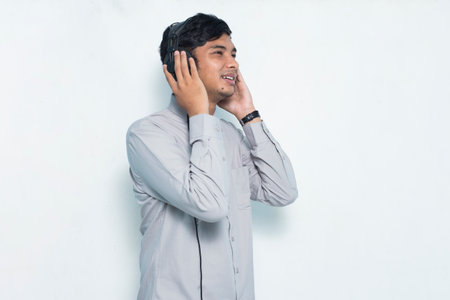 Cheerful young Asian Muslim man using a mobile phone and looking away isolated over white background