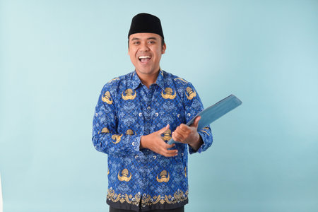 government worker man wearing kopri blue batik uniform holding a clipboard. Concept of professionalism and confidence,. PNS, ASN civil servant concept.
