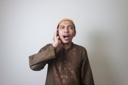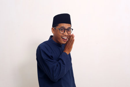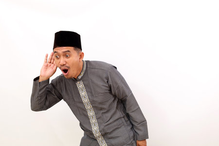 Surprised asian muslim man standing while hearing a good news from sideways. Isolated on white