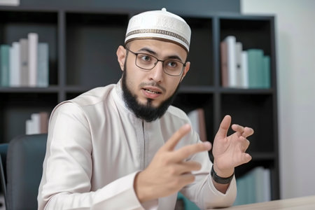 A young Muslim entrepreneur at a co-working space, blending modern business practices with traditional ethical values.