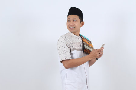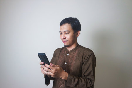 Cheerful Indonesian man in moslem wear using his phone, sending greetings for Ramadan or Eid al-Fitr. Modern Islamic lifestyle concept with copy space.