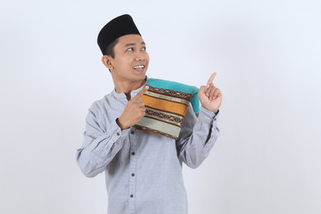 Joyful Asian man in traditional Islamic clothing holding a prayer mat, celebrating Eid al-Fitr or Ramadan Kareem on a white background.