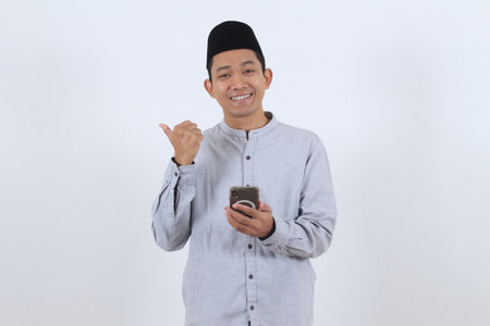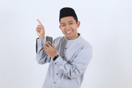 Cheerful young Southeast Asian Muslim man holding a phone and pointing at copy space. Perfect for Ramadan, Lebaran, or tech ad campaigns.
