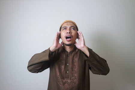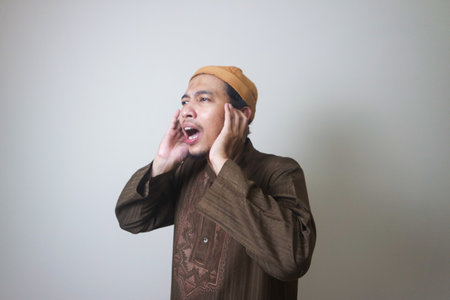 funny facial expression of asian muslim man wearing cap shocked looking at phone screen