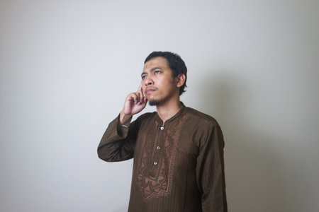 Portrait of a thoughtful young Indonesian Muslim man pondering a decision. He looks serious and contemplative, considering a solution to a problem.