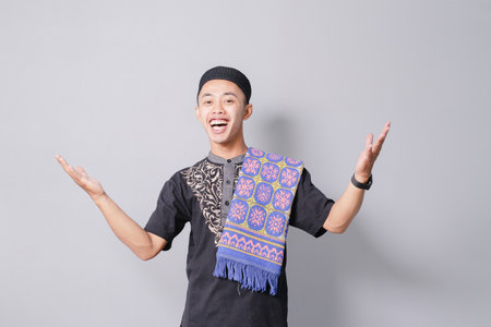 Cheerful Indonesian man in peci and baju koko celebrating Ramadan or Eid. Happy male model gesturing towards your message or product.