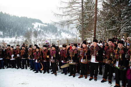 Kryvorivnia, Ukraine - January 7, 2019: Famous hutzulian Koliadnyky of Kryvorivnia singing Christmas carols and marching around ancient wooden church. Old winter traditions of Carpathian mountains.