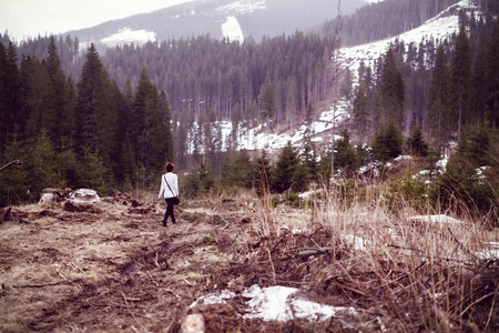 Woman tourist witnessing a desolated landscape of forests being cut down