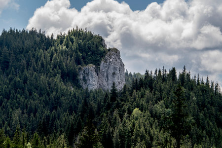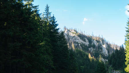 Mountain landscape with cliffs and coniferous forest in the background