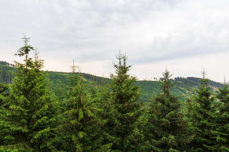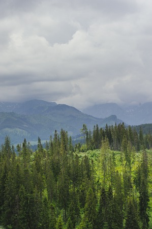 Mountain landscape with coniferous forest and cloudy sky in summer