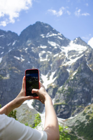 Taking a photo of the snow-capped mountains with a smartphone