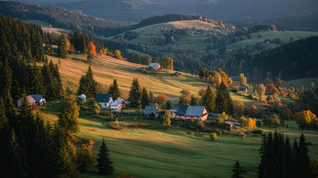 Discover a breathtaking autumn landscape featuring a charming village nestled among rolling hills, bathed in warm sunset light that enhances nature's vibrant colors.