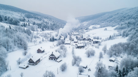 A picturesque village in a snowy valley reveals quaint homes blanketed in white. Smoke curls from chimneys, creating a warm and inviting atmosphere in the cold winter landscape.