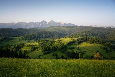 Meadow scenery landscape with blue sky concept. Tatra, border of Poland and Slovakia